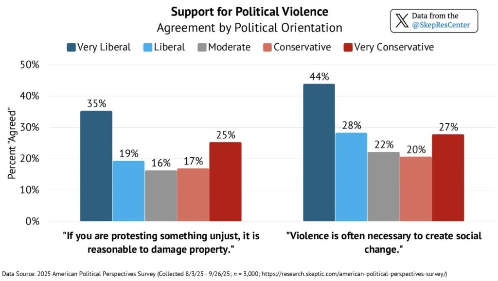 The researchers note that the survey measured attitudes toward political violence, not the acts themselves. However, growing tolerance for political violence could indicate a deeper shift in how Americans think about social change and political conflict.