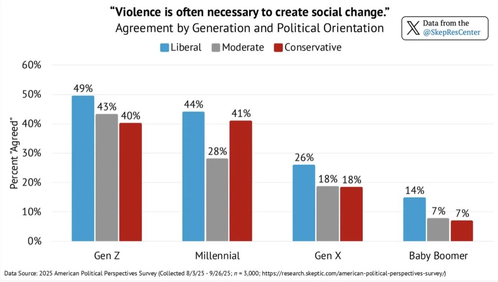 A new national survey suggests that support for political violence has dramatically increased among younger Americans, particularly among those who identify as “very liberal,” hold graduate degrees, and/or belong to the GenZ demographic.