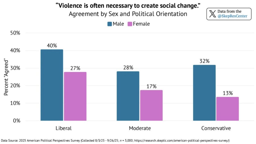 Support for political violence was highest among those identifying as “very liberal.” Nearly half of liberal GenZ respondents agreed that violence can be necessary to create social change.