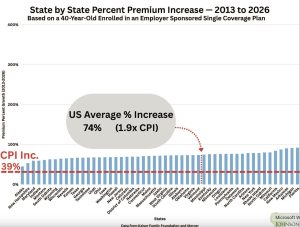 From 2013 to 2026, the average employer-sponsored single-coverage plan for a 40-year-old in Alaska has risen by roughly 45%, which is a rate slightly higher than overall inflation during the same period, 39%. The national average increase for employer plans is 74%, or nearly double the rate of inflation.