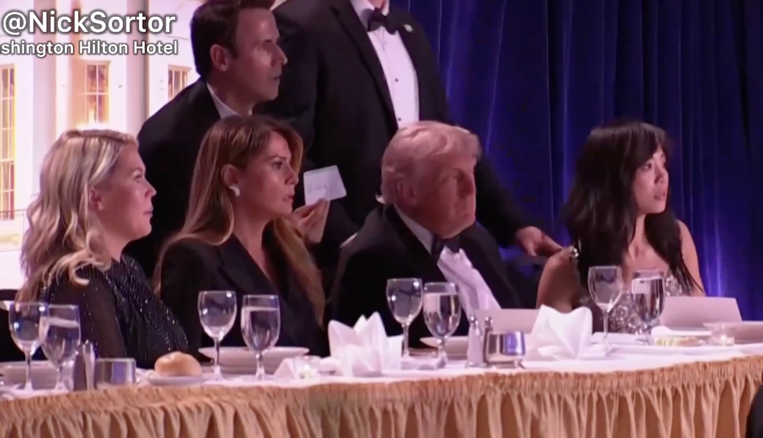 According to multiple accounts from inside the ballroom, loud popping sounds—described by attendees as “POP POP POP POP”—rang out just minutes after the president had been seated. Within seconds, panic spread through the packed room, with attendees diving to the floor for cover.