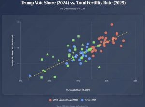 The above chart, which overlays 2024 Trump vote share by state with the CDC’s 2025 provisional total fertility rates, highlights a demographic and political divide that is increasingly difficult to ignore.