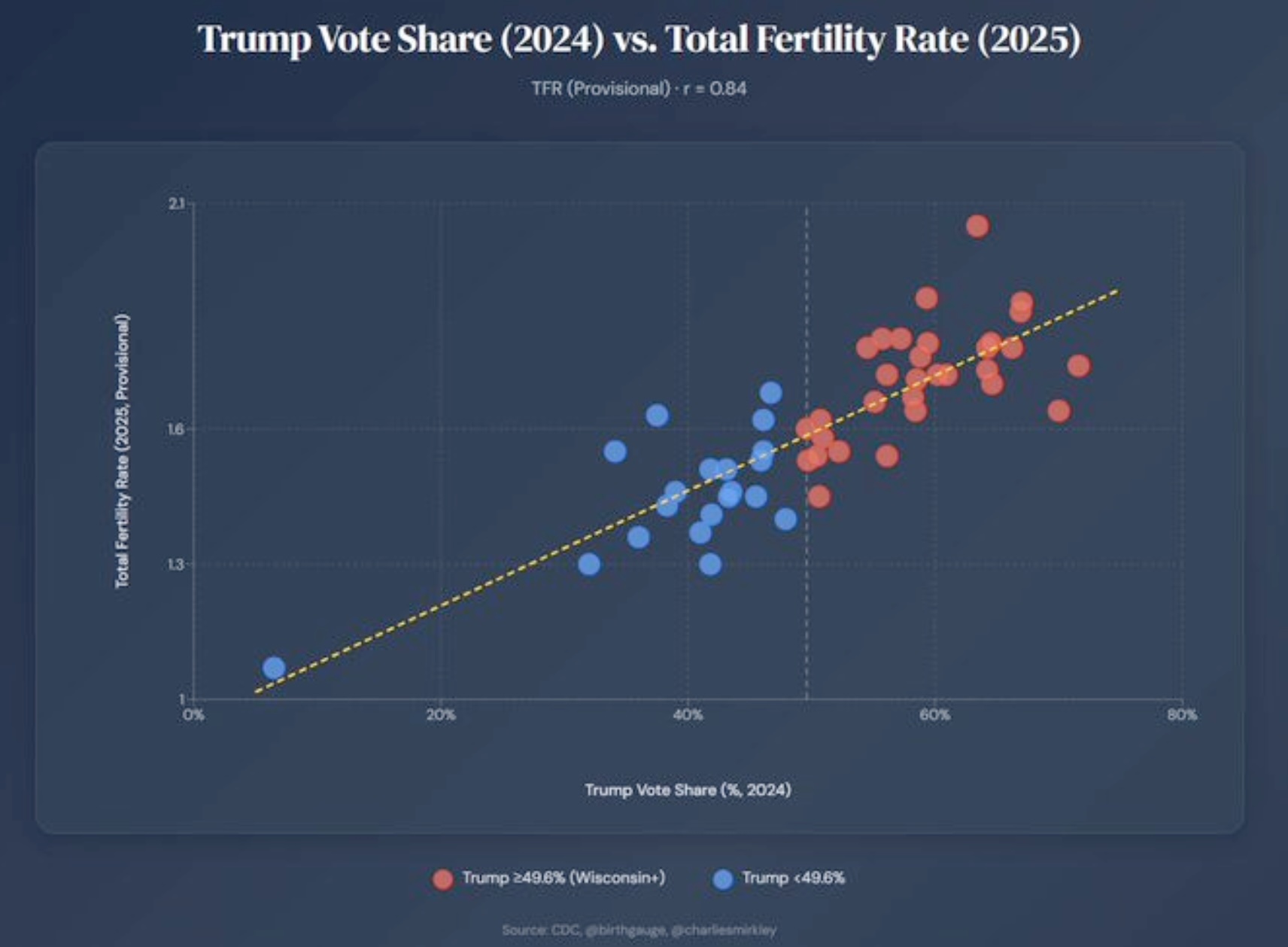 The above chart, which overlays 2024 Trump vote share by state with the CDC’s 2025 provisional total fertility rates, highlights a demographic and political divide that is increasingly difficult to ignore.