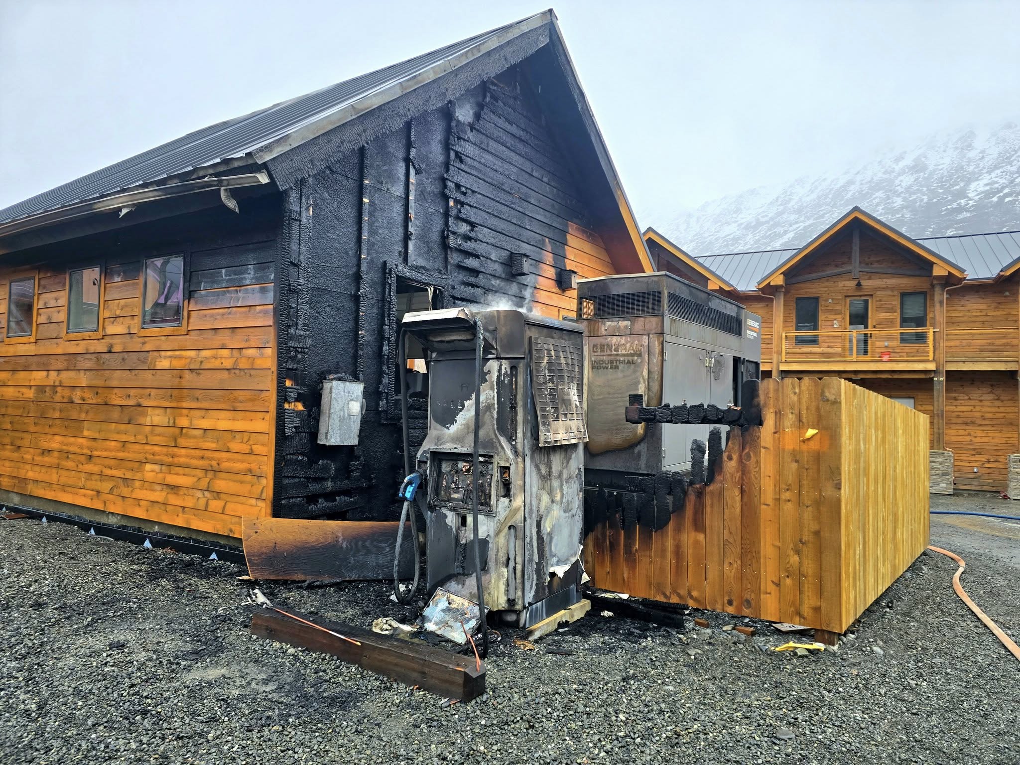 April 9, 2026 – A charred black wall, melted charging equipment, and a scorched wooden shed were the work of an electric vehicle charging station fire at Grizzly Ridge in Cooper Landing, a reminder that EV infrastructure is still new to Alaska, and perhaps a cautionary note about placing high-energy battery systems next to flammable structures.