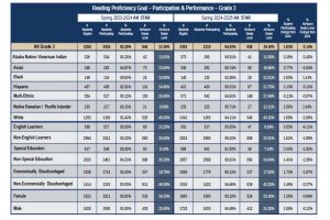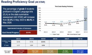 The board’s goal is that the percentage of grade 3 students proficient in reading on the state summative assessment, the AK STAR, will increase from 32.4% in May 2023 to 46.4% in May 2028.
