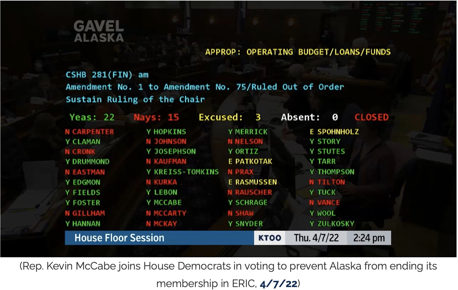 When we sought to follow the example of other Republican states by ending Alaska’s membership in ERIC, Rep. Vance and Rep. McCabe not only voted against ending membership in ERIC, but they also voted to prevent other legislators from being able to debate it. Rep. McCabe even went so far as to join Democrats in voting to block ERIC membership from even coming up for a vote. Ten years on, most Republican states have left ERIC, but our voter roll continues to still be tied to it, which has only made the problem worse.