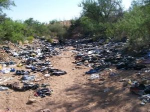 A 2003 article by author Annette McGivney recounted her hike to Sweetwater Pass in Organ Pipe. She wrote how you can’t get lost, “just follow the trail of trash. Pants, cans, shoes, bicycles, phone cards, socks, a Bible, underwear. And enough plastic water jugs to choke a landfill.” Coming across a wash along the way full of empty water jugs, McGivney quoted a hiking companion, a park employed biologist who said, “we don’t pick them up anymore, we can’t make a dent”.