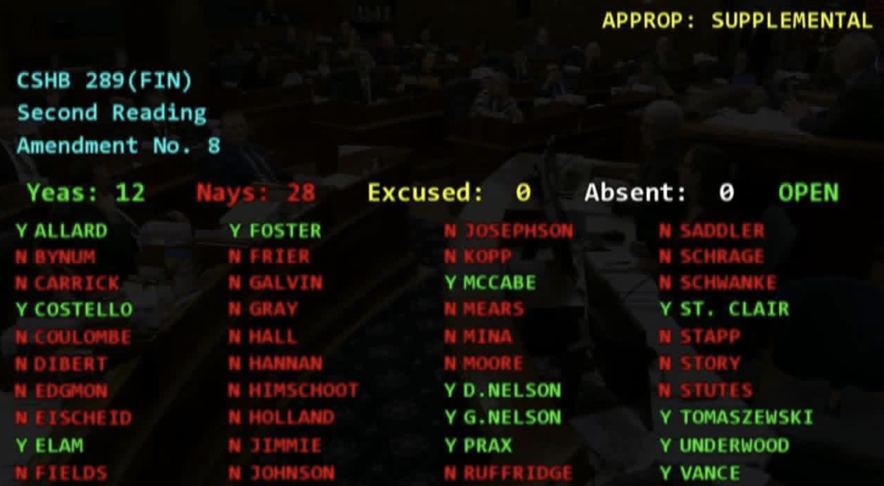 Yeas (12): Allard, Costello, Elam, Foster, McCabe, D. Nelson, G. Nelson, Prax, St. Clair, Tomaszewski, Underwood, Vance.