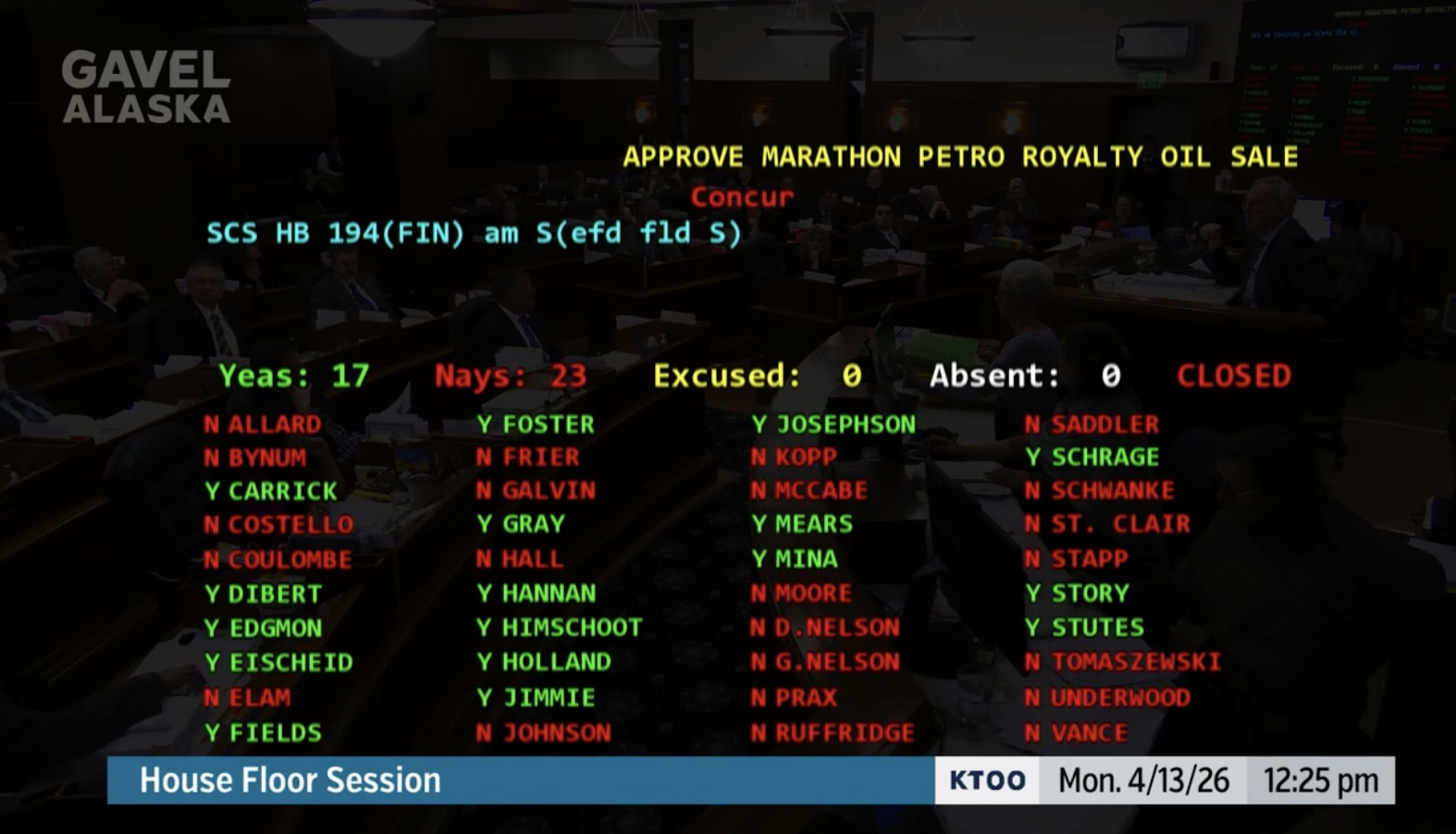 April 14, 2026 – The Alaska House on Monday rejected a Senate-warped version of House Bill 194, a bill requested by Gov. Mike Dunleavy that originally was a simple approval of the state’s sale of royalty oil to Marathon Petroleum’s Nikiski refinery. It was a routine agreement widely seen as beneficial to state revenues and in-state refining jobs.