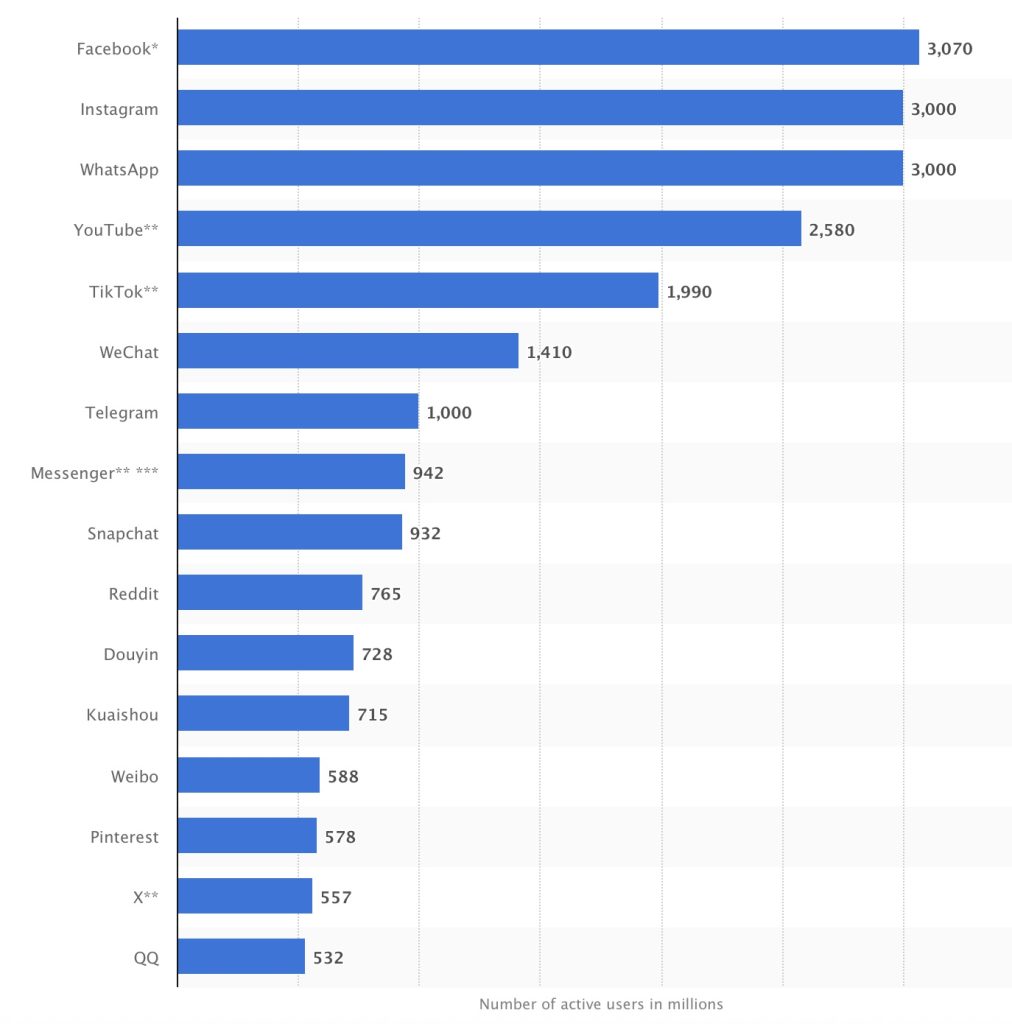 Meta remains the undisputed market leader. Its flagship site, Facebook, was the first social network to surpass one billion registered accounts and today counts more than three billion monthly active users. Meta’s family of products—Facebook, WhatsApp, Messenger, and Instagram—each exceed one billion users, and together reached about four billion monthly active users in the third quarter of 2023.