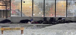 Photos taken in downtown Anchorage during sub-zero temperatures show people sleeping on bare ground, wrapped in blankets and tarps, sheltered only by doorways and building overhangs.