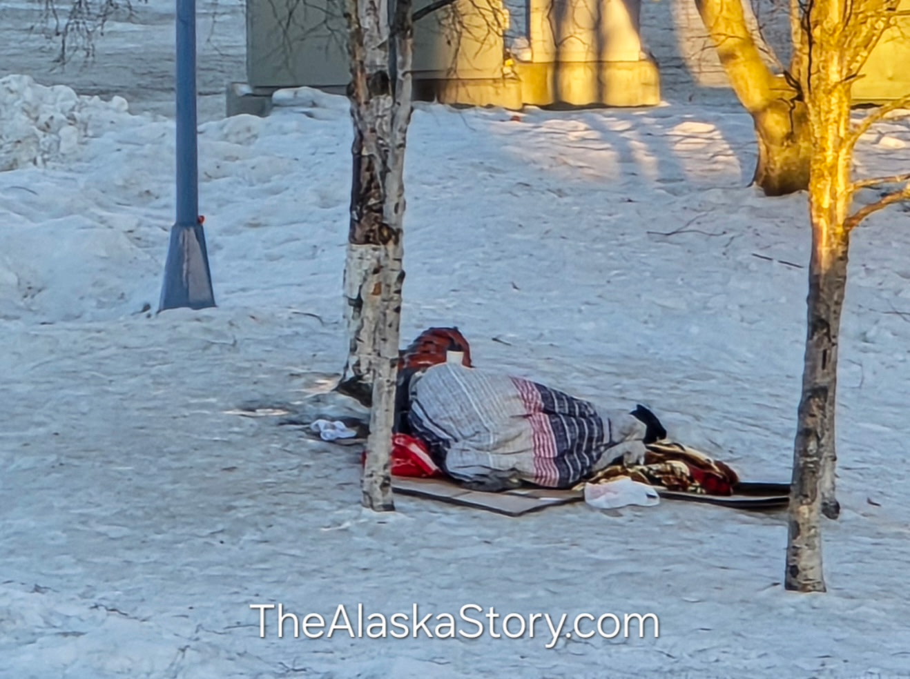 Photos taken in downtown Anchorage during sub-zero temperatures show people sleeping on bare ground, wrapped in blankets and tarps, sheltered only by doorways and building overhangs.
