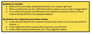 Organizers are told that every campaign must define three core elements: a demand, a target, and a “villain.” The handbook advises students to clearly assign blame for perceived problems, naming examples such as “Trump, ICE, and the billionaires who rigged the system.”