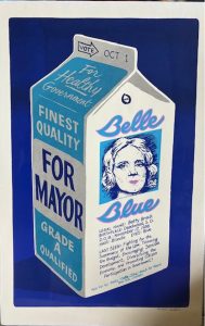 Local artist Bill Hudson of Folk Festival poster fame rose to the occasion and soon the Belle Blue on a milk carton print was the hottest piece of artwork in Juneau: “Belle Blue LAST SEEN:  Fighting for the Supremacy of the Law, Trimming the Budget, Encouraging Sensible Development, Diversifying the Economy, and Promoting Citizen Participation in Government!”