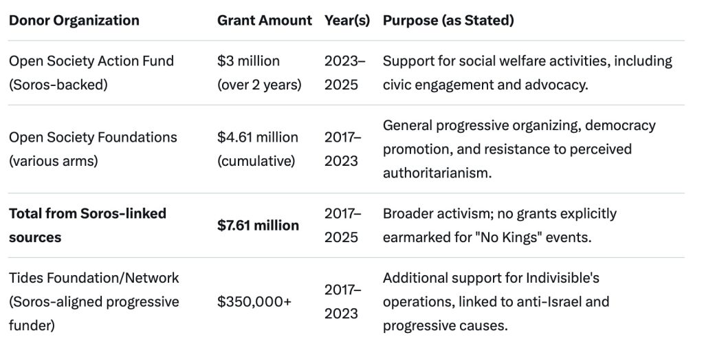 George Soros’s Open Society Foundations has provided significant funding to key organizers of the “No Kings” protests, particularly the Indivisible Project, which played a central role in coordinating logistics, data management, and participant communications.