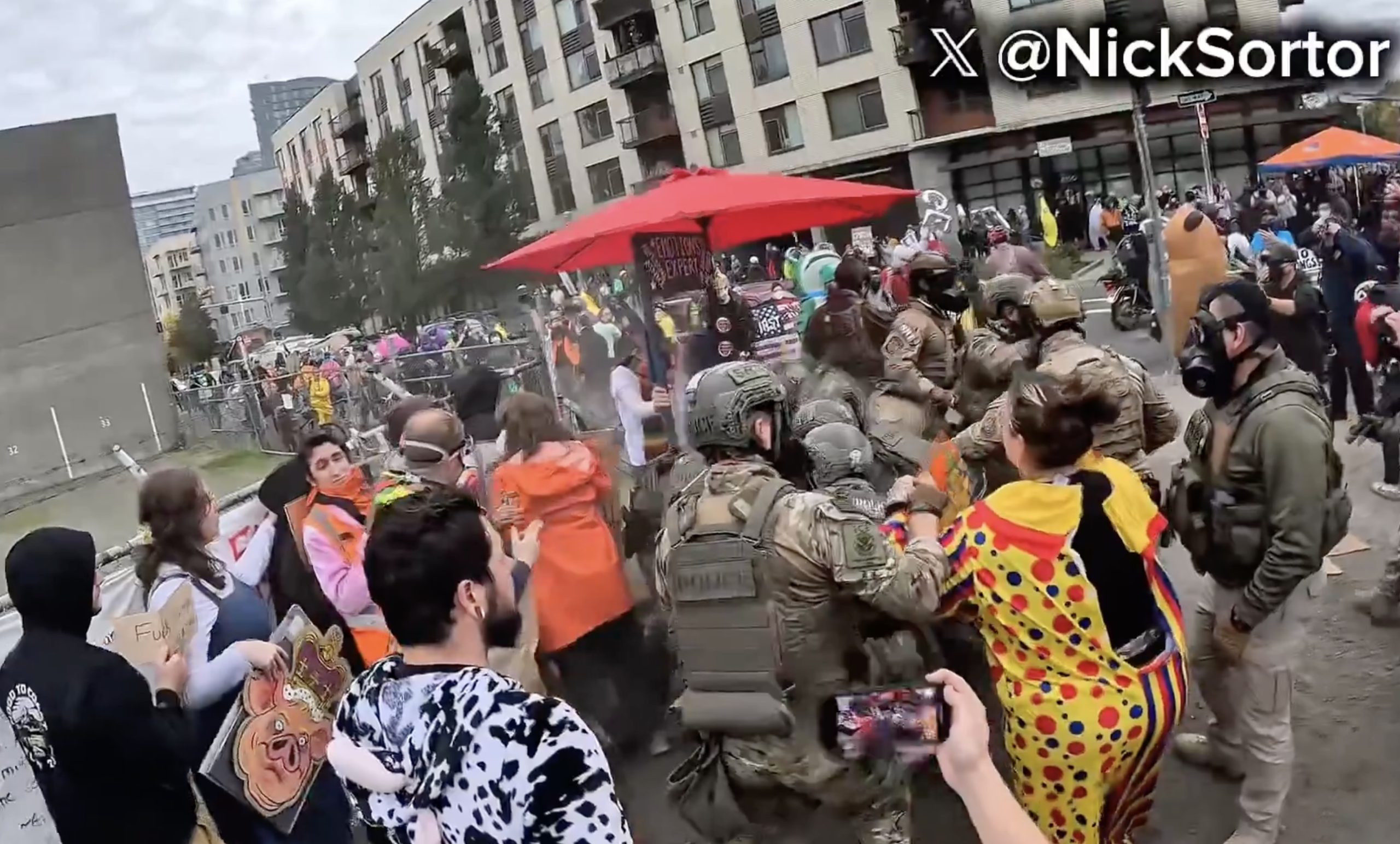 A good number of the protesters were dressed in animal costumes, inflatables, and other wild attire, and overnight they were filmed lobbing fireworks and Molotov cocktails back at federal agents who were trying to disperse them. At times, the street scene devolved into hand-to-hand combat. Several fires were started by rioters.