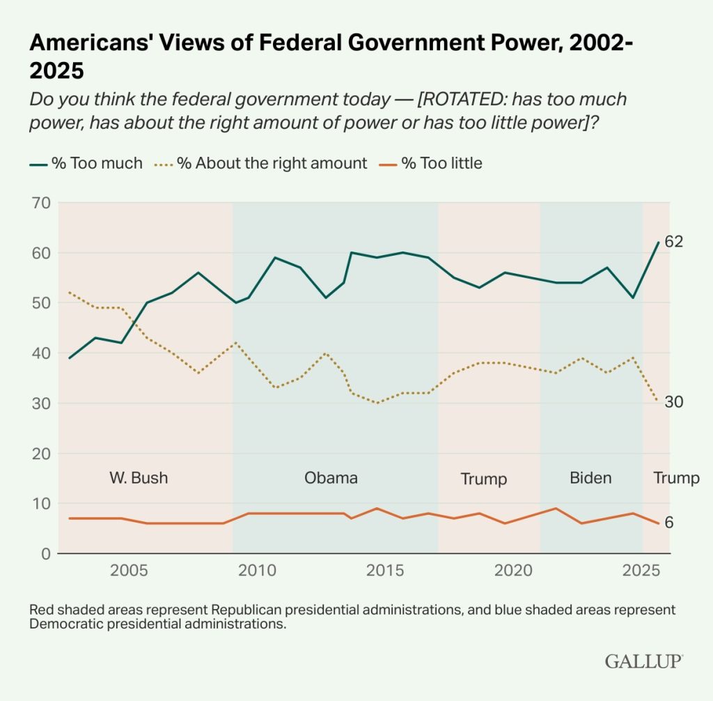 What’s unusual is that while normally Republicans want to tamp down federal authority, the current shift appears to be driven largely by changes among Democrats. Now that Donald Trump is back in the White House, 66% of Democrats and Democratic-leaning independents say the federal government has too much power, a dramatic rise from 25% last year.
