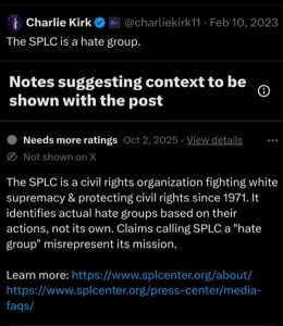 In 2023, the late Charlie Kirk, who was assassinated last year by a leftist, wrote on X that SPLC is a hate group. His post was “community noted” by X, which defended the group’s reputation as a civil rights group. The proposed community note never got enough up-votes to go through, however.