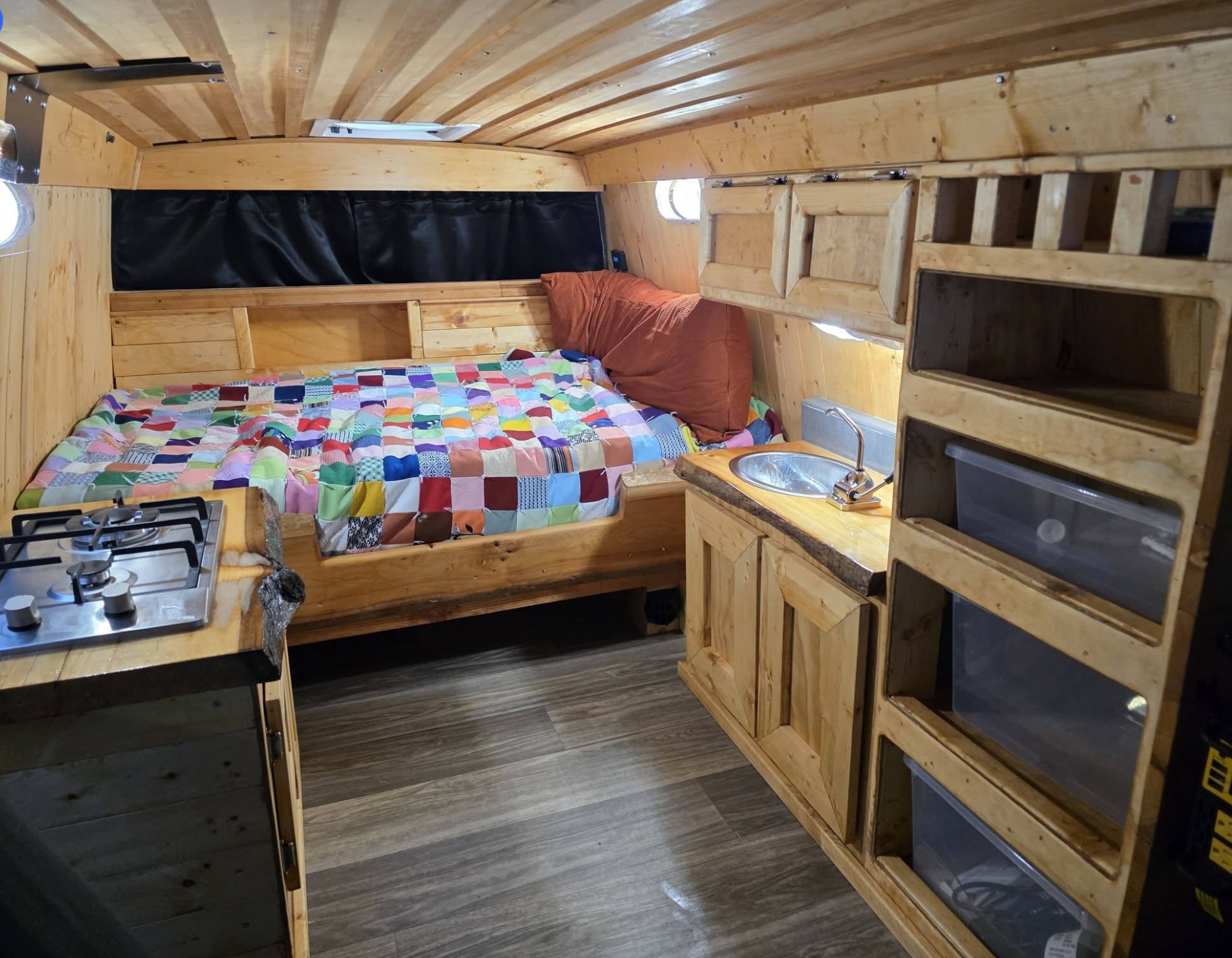We spent just over $6,000 on the vehicle and brought it home, placing it in our garage for conversion. The goal was to build a living space my wife and I would be proud of; built with quality and love, but on a budget. Immediately, I got on Amazon and ordered many of the supplies we would need: a solar kit, various electrical components and lights, a propane stove, Chinese diesel heater (awesome and affordable), a basic water pump, and more. Scrounging locally, we obtained some items for free, like a used sink and water tank. In Southeast Alaska, driftwood is everywhere, and I had previously used my “Alaska Sawmill” (a chainsaw attachment) to cut live-edge planks that I would use for countertops.