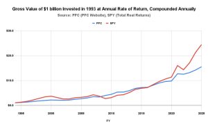 In this chart, we’re looking at what would have happened to a billion dollars invested the same as the Permanent Fund returns (blue) compared to an S&P 500 index fund (red) since 1993. Please note that this chart is strictly based on the investment returns. It doesn’t take into account any payouts (PFDs or government draws) or deposits (yearly royalties from oil). Except for the 2008 financial crisis and a short time thereafter, we would have been better off using the index fund. Please note that this does not take management fees into account either. The Permanent Fund Corporation management fees have a history of being significantly higher than those of an index fund. That would further depress the PFC returns compared to the index fund.