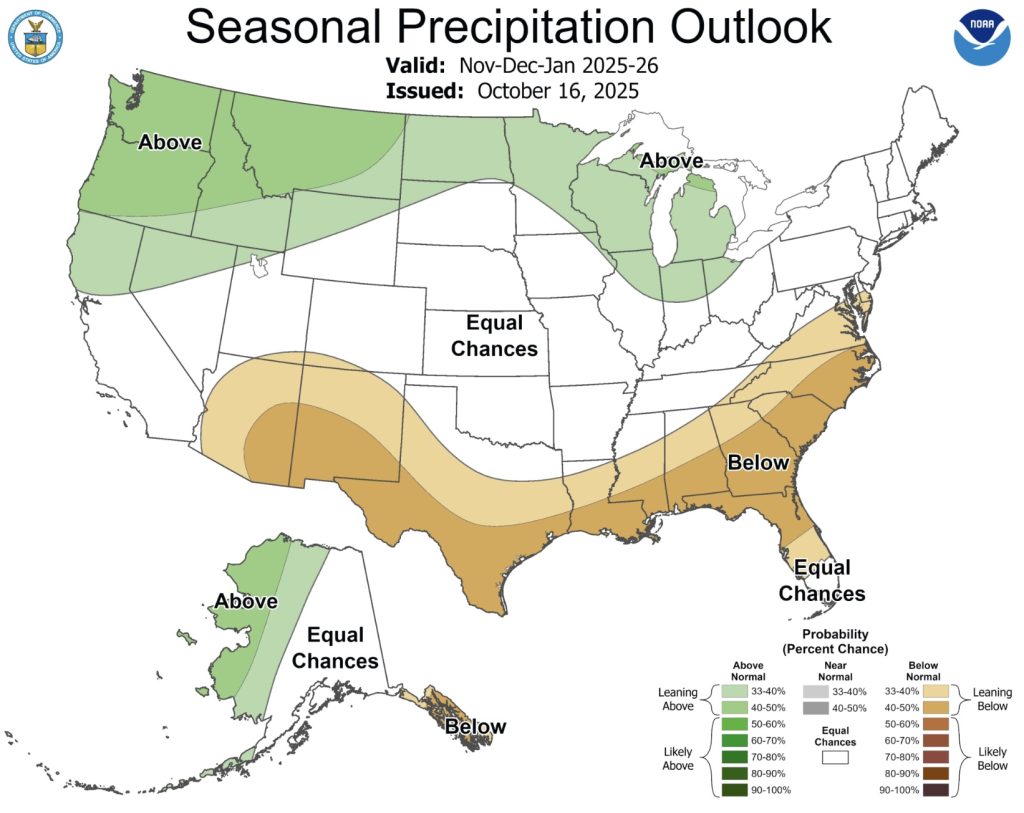 Altogether, the forecast reflects a textbook La Niña pattern heading into winter: a warmer southern tier, a wetter northern tier, and a mixed picture for Alaska as the climate patterns recycle once again.