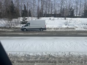 The white van that brought the sign to the location at the corner of Jewel Lake and Raspberry Road.