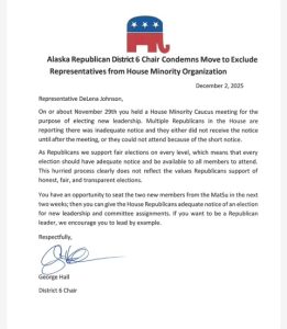 District 6’s rebuke follows similar letters from district committees across the state, from Fairbanks to Anchorage to the Kenai Peninsula, all objecting to the process, which involved a rushed leadership vote and the exclusion of two unrepresented districts.