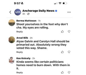 It is not immediately clear whether Knicely’s comment has been reported to the FBI, state law enforcement, or whether any investigation is underway. But he is evidently still a public servant, paid for by the Alaska treasury and US taxpayer dollars, while making statements in social media that could be legally actionable.