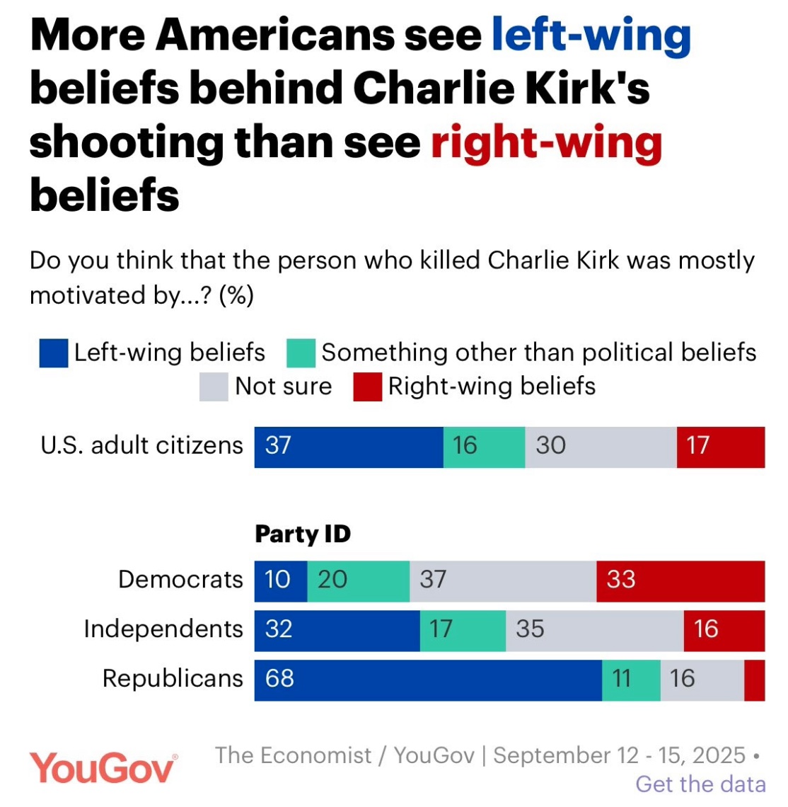 A new YouGov poll finds that most Americans believe the man who assassinated conservative activist … Continue reading YouGov poll: Most Americans see Charlie Kirk’s assassin as motivated by the political left